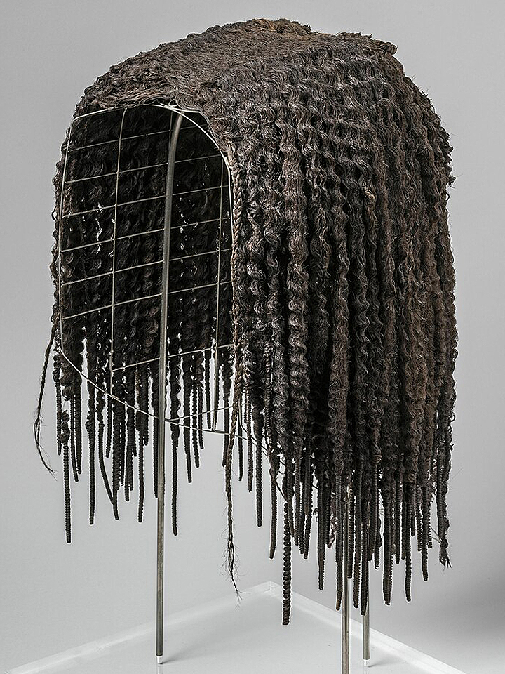 In the New Kingdom, noble women are often shown wearing sheer linen dresses, cinched at the waist with a sash or belt, and sometimes covered with a capelet. Collar-style necklaces were common, as well as headpieces. Wigs were also fashionable during this time, sometimes to cover shaved heads. Our mummy still has short, red hair, though the color may be a result of the mummification process.